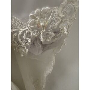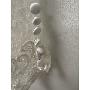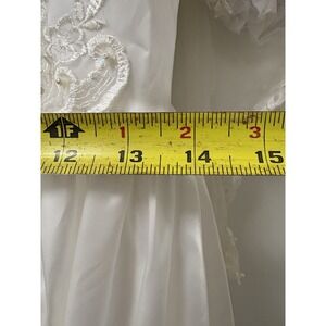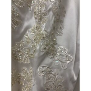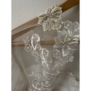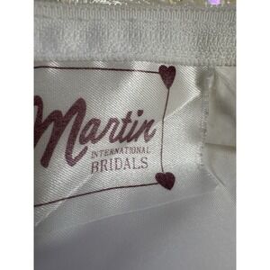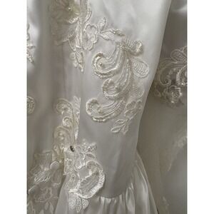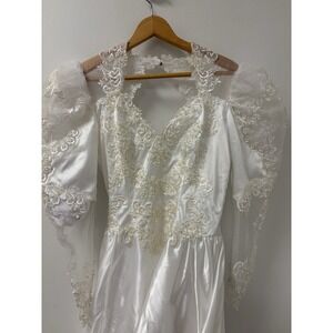 The product is a vintage San Martin wedding dress from the 1990s, featuring intricate lace embroidery and tulle detailing. The dress has long sleeves and a train, adding to its elegant design. The size is listed as medium (6-8), with a classic white color and made from lace fabric. Perfect for a bride looking for a unique and timeless wedding gown with a touch of vintage charm.