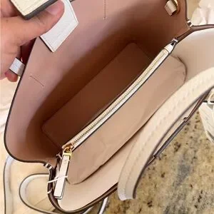 Gold hardware double T logo on front, top handles drop 4.5" (11.4 cm)