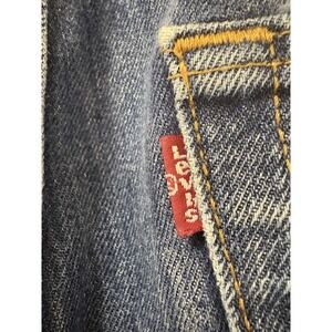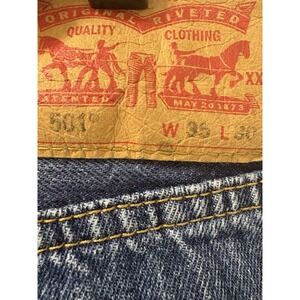 The product is a pair of Levi's 501 Men's Straight Leg Button Fly Jeans in a classic blue denim color. Made of comfortable cotton denim fabric with a medium wash, these vintage style jeans feature a button closure, classic fit, and are part of the Levi's 501 Series. The jeans have a regular size of 35x30, making them a versatile and timeless addition to any man's wardrobe. Perfect for a grunge-inspired look, these Levi's jeans also offer the convenience of pockets for added functionality.