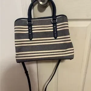 Elegant satchel with navy and cream stripes. Features sturdy handles and a detachable strap. Ideal for everyday use. This is a popular hard to find style from the brand’s Larchmont Avenue line