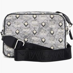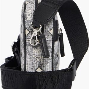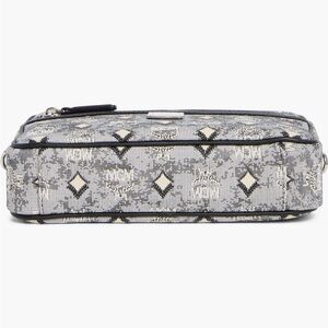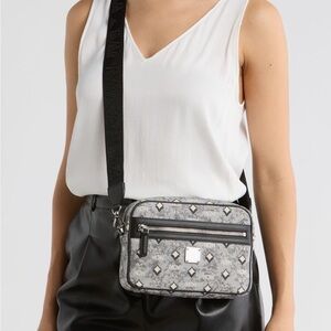 Compact MCM crossbody with signature Visetos monogram. Ivory and black patterned coated canvas. Black leather trim and adjustable strap. Front zip pocket with silver hardware. Elegant daily-carry design.
