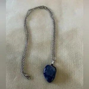 This piece was tumbled in a rock tumbler, then covered with a light coat of epoxy. The chain has been up-cycled from a piece of costume jewelry. Total length with pendant is 28”