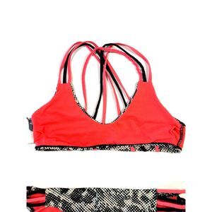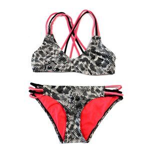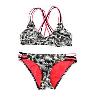 Sexy BCA by Rebecca Virtue two piece bikini features a bold black white and pink geometric snake print. The top has a flattering V neckline with trendy strappy back detailing and a spot to add your own padding. The matching hipster bottoms offer a comfortable stretch fit.
