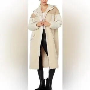 Chic teddy jacket with a cozy hood. Cream and tan design. Ideal for cool weather.