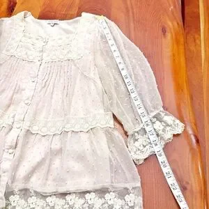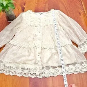 Vintage Romantic Boho Cottagecore Lace Embroidered 3/4 Sleeves Square Neck Cream White Button Down Blouse Shirt.