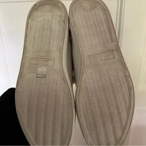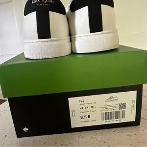 Classic low-top leather sneakers. White upper with black spade patch on side. Black heel accent and soft pink interior lining. Clean modern look. Lace-up styling. Worn once, runs slightly large.