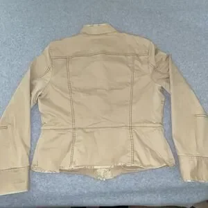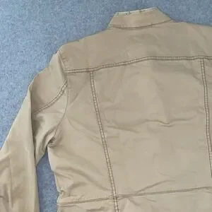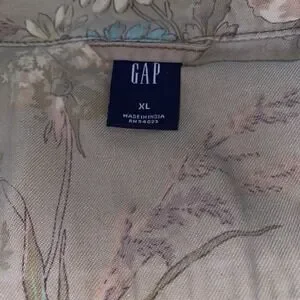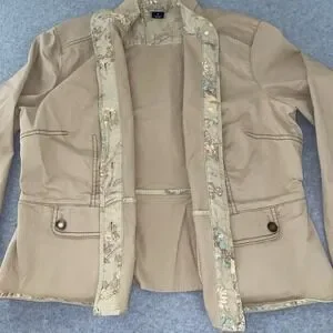 This is a stylish GAP women's jacket in size XL, designed with a flattering fitted waist and peplum-style hem. The jacket is made from a durable cotton-blend twill fabric and accented with a floral trim lining for a unique contrast look. Features include a button front, stand collar, flap front pockets, and button cuff sleeves.