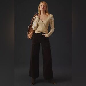 Elegant V-neck sweater with intricate lace details. Soft knit fabric. Perfect for layering.