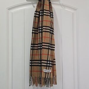 Classic Burberrys plaid cashmere scarf. Tan base with black, white and red check pattern. Soft feel with fringe ends. Timeless wardrobe staple.