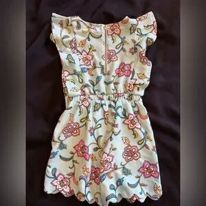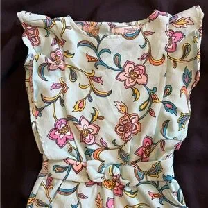 Charming floral one piece. Features pink and blue flowers. Scalloped edges add a cute touch. Perfect for playful days.