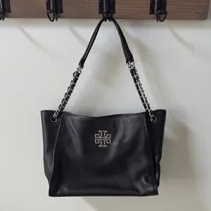 Chic black shoulder bag with chain straps. Features Tory Burch logo. Perfect for versatile styling.