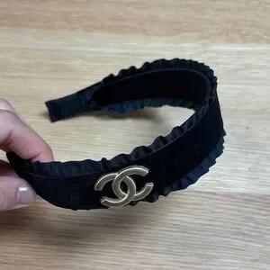 Luxurious black velvet headband with a gold interlocking emblem. Ruffled trim adds delicate texture. Sleek and elegant accessory for refined styling.