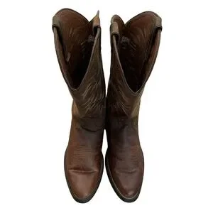 Classic cowboy boots with intricate stitching. Durable leather construction. Ideal for everyday wear.