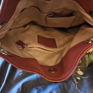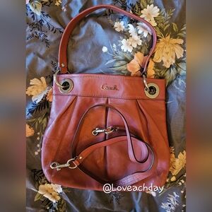Authentic Coach leather shoulder bag in dusty rose. Smooth leather with polished hardware and a versatile strap for shoulder or crossbody wear. Elegant pleated front and subtle Coach logo for a refined everyday style.