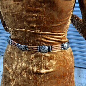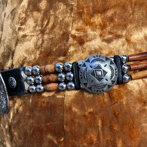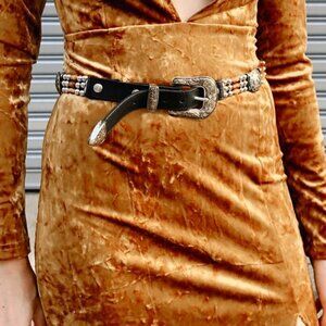 Vintage Boho Antiqued Silver Black Buckle Beaded Leather Belt