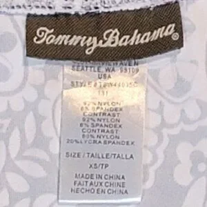Gently worn navy and white rash guard swim shirt with contrasting coral trim by Tommy Bahama.