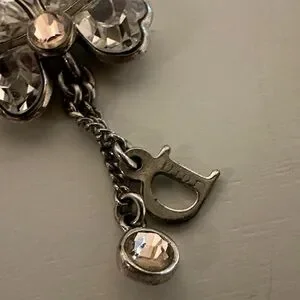 The design features a butterfly motif set with clear rhinestones, with a dangling charm that includes the signature "D" logo and an additional iridescent rhinestone droplet.