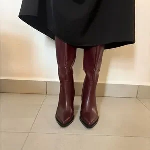Elegant tall boots in a rich burgundy. Smooth finish with a pointed toe and block heel for stable, stylish wear. Easy to pair with dresses or tailored outfits. Comfortable fit through the calf and ankle. Burgundy color adds a sophisticated touch to any look.