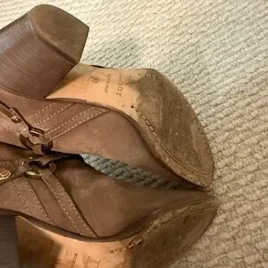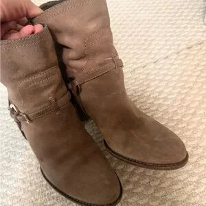 Elegant taupe suede mid-calf boot with a stacked heel. Gold-tone hardware and buckle detail add refined shine. Soft suede upper and secure ankle fit for all-day comfort.