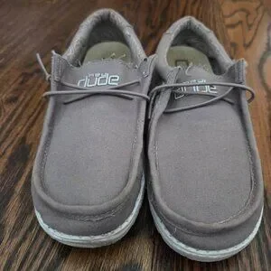 Features a soft knit upper, comfortable elastic lacing, and "Hey Dude" branding on the heel.
