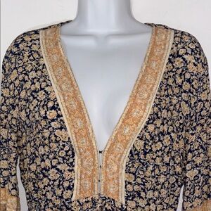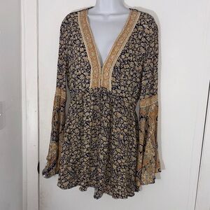 Flowy romper with a deep V-neck. Long, relaxed bell sleeves. Navy floral print with mustard border details. Lightweight and breezy for everyday wear. Effortless boho vibe. PTP 23 Lenght 31