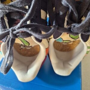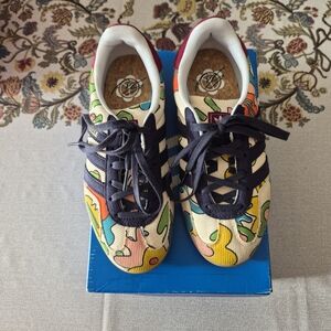 Playful multicolor graphic unisex sneakers from adidas. Navy laces and trim for contrast. Bright accents in pink, yellow, green, blue, orange and burgundy.