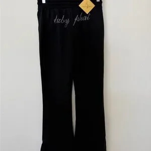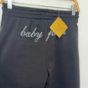 Soft black joggers with elastic waistband. Rhinestone "baby phat" script across the front. Casual and sparkly for everyday wear.