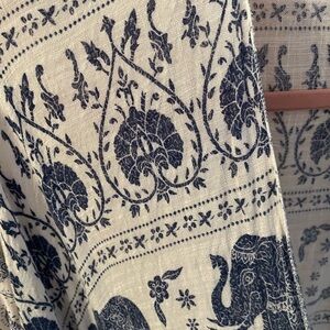 Embrace a bohemian vibe with this stylish elephant gauze print cardigan. Featuring a chic fringe detail, this is perfect for layering. The elegant blue and white design adds a touch of sophistication to any outfit. One size, up to large.