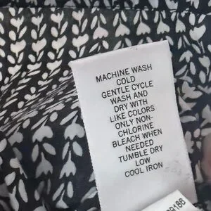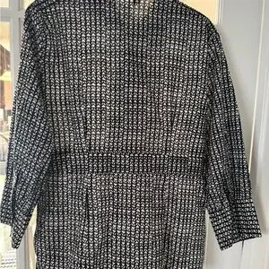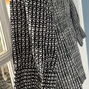 Chic monochrome top with a leaf pattern. Ideal for versatile styling. Button front with banded waist. Can be worn as a button up or as an over shirt.