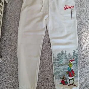 Cream joggers with festive Grinch design. Comfortable and playful style.