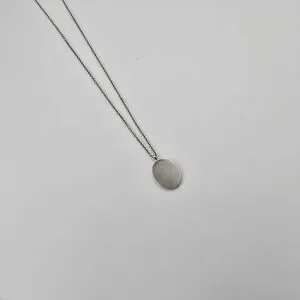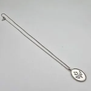 Me & Ro necklace with an oval pendant. Engraved floral design on the pendant. Polished silver finish on pendant and chain. Elegant and versatile for everyday wear.