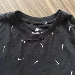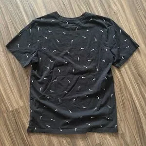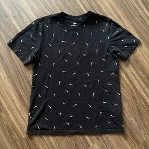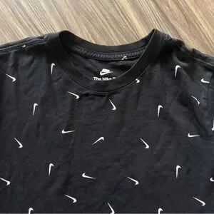 Nike RARE All-Over SWOOSH Print Black Tee. Pre-loved, but still nice! Sold as is with lots of pictures. Feel free to zoom in as I occasionally miss a tiny snag, faint stain or loose fuzzy. Measurements in photos to help you know if it’ll fit. From a clean & smoke-free home. CERTIFIED RAD by @DubsmashDude 🤙🏼
