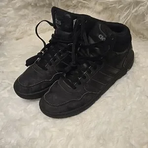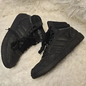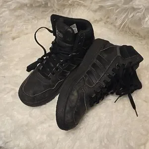 These Adidas sneakers feature a sleek, all-black design with a high-top silhouette for superior ankle support. Made from a suede-like material, they offer a soft, matte texture that enhances their modern look. The durable rubber sole provides excellent traction, making them perfect for both athletic and casual wear.