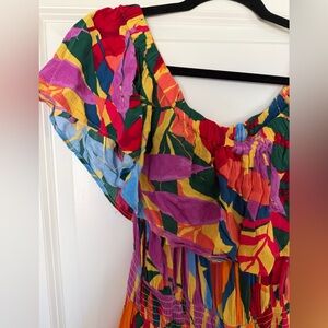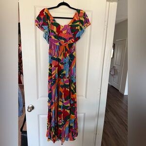 Brighten your look with this Terra & Sky maxi dress. Features a lively mix of red, pink, orange, blue, and green. Perfect for any occasion.
