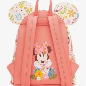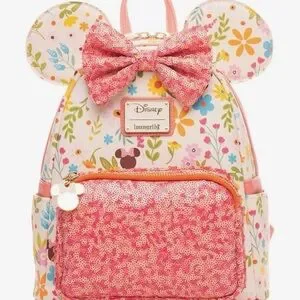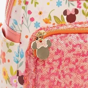 Adorable Loungefly backpack with floral Minnie Mouse design. Pink sequined front pocket. Cream background with colorful flowers.