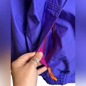 Vintage Woolrich colorblock windbreaker jacket featuring bold 90s retro colors in purple, teal, pink, and orange. Classic outdoor style with a lightweight feel and functional design.