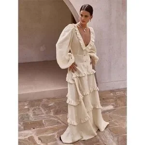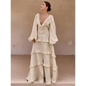 Enchanting elegance defines this stunning maxi dress, a vision of bohemian grace. The dress features a flattering V-neckline framed by delicate ruffles, leading to a button-down front that adds a touch of vintage charm. Long, voluminous sleeves create a dramatic silhouette, while the tiered skirt cascades in soft, flowing layers, each edged with ruffles for added texture and movement.