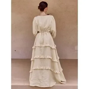 Keywords: ruffled dress, tiered dress, boho dress, bohemian dress, button down dress, cream dress, formal dress, wedding guest dress, party dress, linen dress Bins 037-204