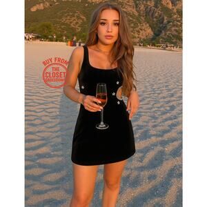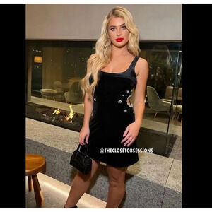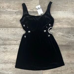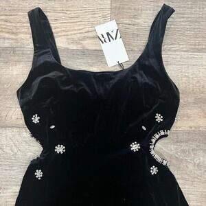BLOGGER FAVE!!! Black short dress with straight neckline and wide straps. Side slits with jewel appliqué. Back hidden in-seam zip closure. From ZARA, in size M. New with tags. Sold out in stores.