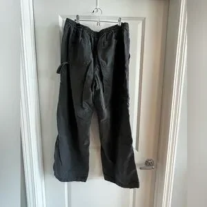 Casual black cargo pants by aerie. Elastic waist with white drawcord. Multiple cargo and side pockets. Relaxed, easy fit for daily wear.