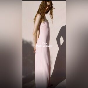 Strapless design with a straight neckline. Smooth, streamlined bodice. Flowing wide-leg trousers create a chic silhouette. Soft pale pink hue offers a delicate look. Minimal, modern styling for dressy occasions.