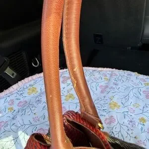 Vera Bradley shoulder bag in a red multi plaid wool-blend. Brown leather trim and handles with gold-tone hardware. Front pocket and structured silhouette. Classic, cozy style for everyday wear.