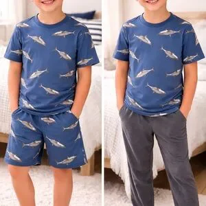 From the Hudson Bay. This PJ set comes with two bottoms! Matching shark shorts and a long grey pajama