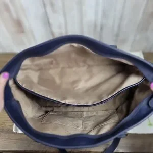 She is a navy monogram coated canvas large tote in good condition. Her exterior is in very good condition. Her interior has some minor soil marks. She would easily hold a laptop and be a durable work bag.