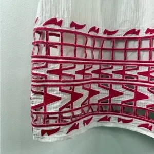 Sea New York white cotton dress with beautiful textured fabric and standout pink embroidered hem detail. This piece has a relaxed, feminine silhouette with subtle pintuck pleating and a partial button front—perfect for spring/summer, vacation, or effortless everyday wear.