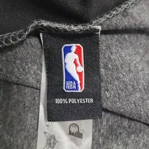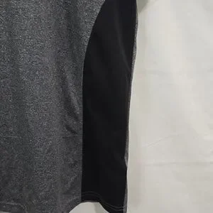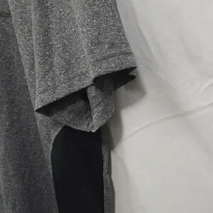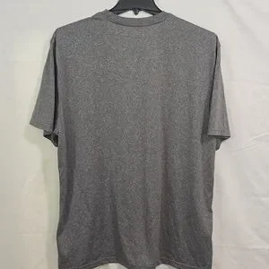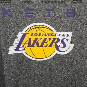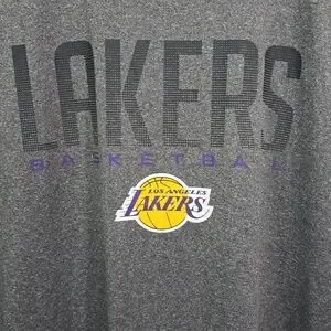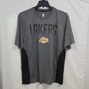 Official NBA Lakers short-sleeve tee in gray and black. Wicks moisture for active wear. Front Lakers wordmark and center team logo. Side panels add contrast. Comfortable for workouts or casual use. Men's XXL. 100% polyester. Machine washable.