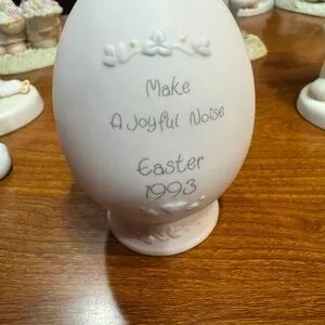Porcelain egg-shaped figurine with raised floral details. Script reads a joyful Easter message and year. Soft pale pink finish with delicate painted highlights. Simple, collectible keepsake piece.