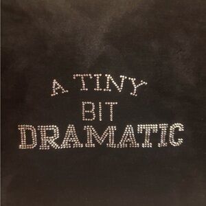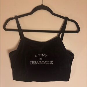 Black cropped tank top with rhinestone text reading "A Tiny Bit Dramatic." Soft, stretchy fabric for a comfortable, close fit. Rhinestone lettering adds sparkle and makes a bold statement.