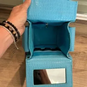 tru brand super cute aqua blue Crocodile-Embossed style Women's box bag / travel small tote with purse feet. In great condition except there is a drawing of a turtle inside the purse. Was there when I purchased & didn't see it. but purse is super cute and unique. No smoke home.