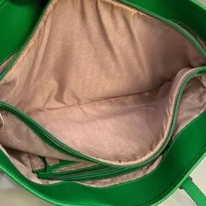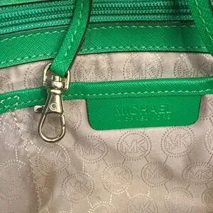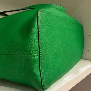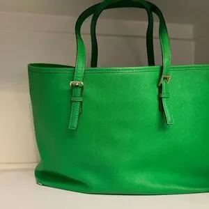 Beautiful Michael Kors tote in vibrant green saffiano leather with gold-tone hardware and signature MK charm. This structured tote is both stylish and practical, perfect for everyday use or travel.